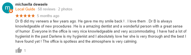 I am loving my new teeth, my new look, and everything about them. They're beautiful, they bite really well, and the bite is fantastic! Everyone says how great they look like and I love it. Have it done! The sooner the better! They are very professional and the pain was minimal. The treatment was always timely and great.